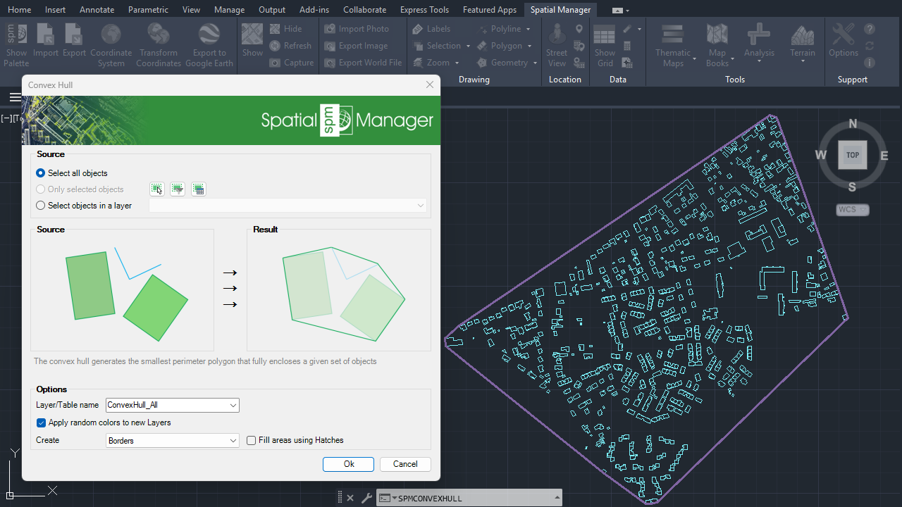 - Type SPMCONVEXHULL in the command line and press Enter or search for the tool in the ribbon or toolbar.