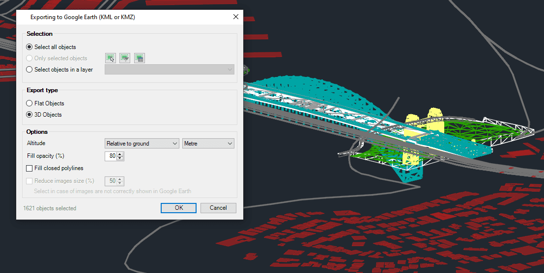 3D modeled objects are exported to Google Earth (KML/KMZ) in a very easy and intuitive way. Different altitude and height modes are available depending on how the model has been created and the way want to be represented (relative to ground, sea floor, absolute…)
