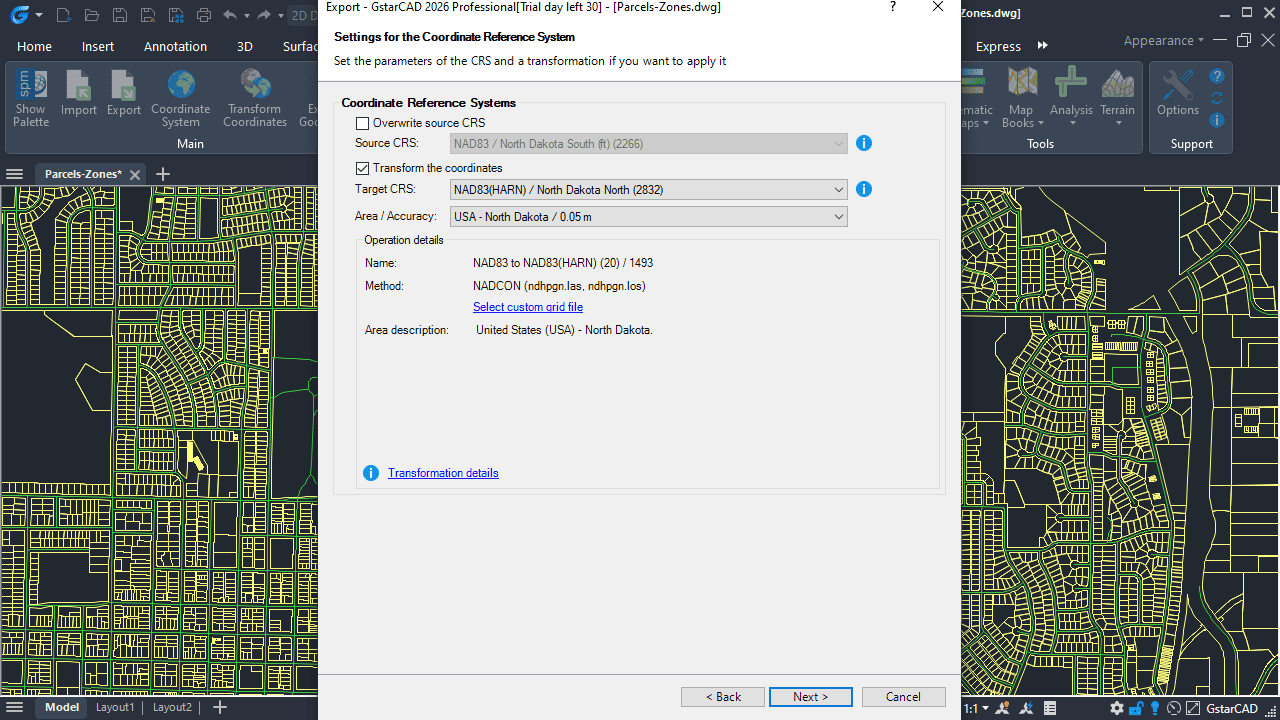 - If there is already defined a coordinate reference system in the drawing, it will be automatically selected.
