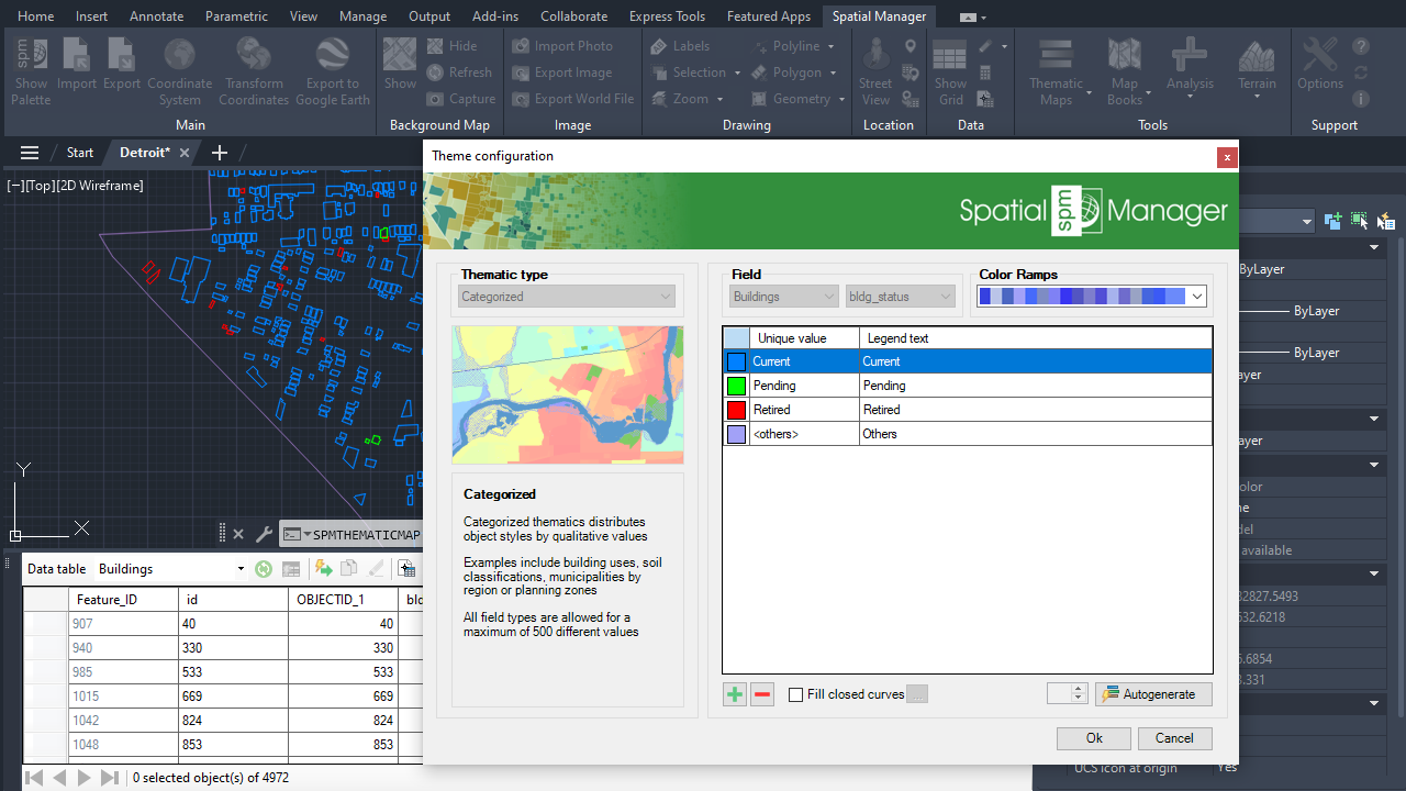 Thematic Maps allow you to view objects colored by their data values, but you can also apply these styles persistently to the objects, causing these colors to override the DWG colors. With this tool, the colored DWG can be shared with other users without requiring the Spatial Manager plugin.