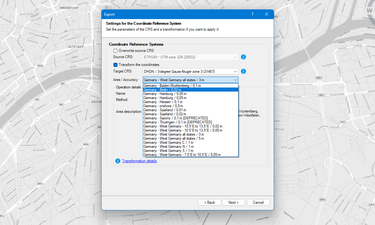 The application automatically assigns the correct source CRS in common scenarios — for example, WGS84 when importing from Google Earth (KML/KMZ) — and lets you select a standard target CRS. For each transformation between two coordinate systems, you can choose among multiple variants, each offering different accuracy levels depending on the region. All transformation details, including the method and parameters, can be reviewed before execution.