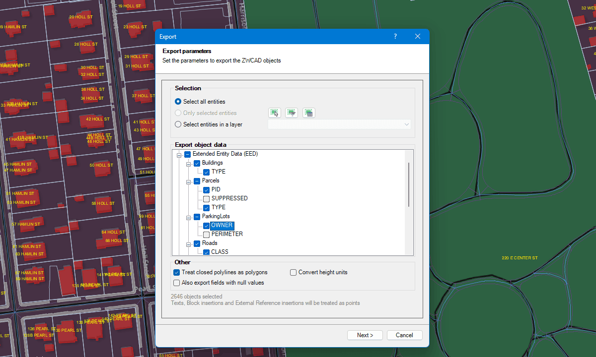Spatial Manager™ for ZWCAD exports objects from the drawing to spatial files or databases, and saves their Extended Entity Data (EED) as alphanumeric data tables using a wizard, which shares some of the steps with the import wizard. In the same way, the user can choose or select the export parameters to define all the target data among a great number of possibilities.