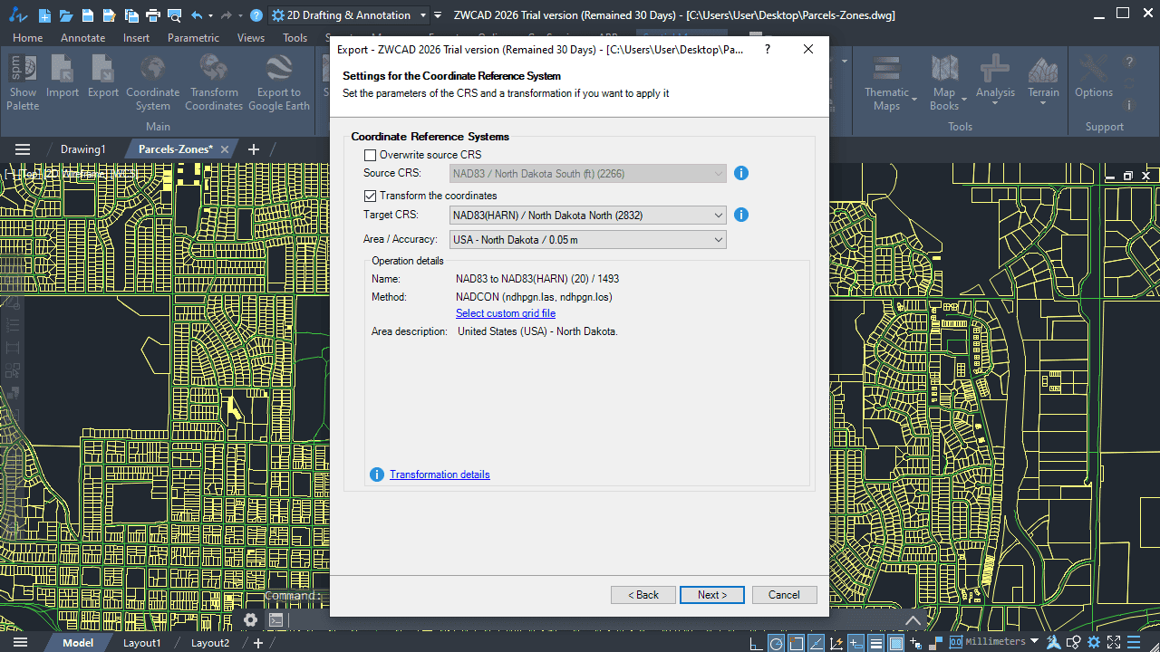 - If there is already defined a coordinate reference system in the drawing, it will be automatically selected.